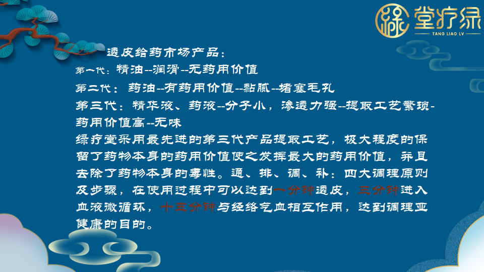 綠療堂產(chǎn)品結(jié)構(gòu)豐富多樣,根據(jù)每一種亞健康不同的生理表現(xiàn)再加之組方的必要性,在提取工藝上對應(yīng)了每一個組方藥性藥理的配伍。采用科學的方式讓其藥性藥理通過不同的產(chǎn)品形態(tài)作用于不同的位置,發(fā)揮其最大的優(yōu)勢和獨特的作用。十余種不同形態(tài)的透皮給藥技術(shù)和產(chǎn)品形態(tài)( 儀器、推拿技術(shù)、精華液、藥液熏蒸、藥油、精油、藥膏、藥粉、藥浴、核心技術(shù)藥貼、灸、藥泥)+藥食同源的口服產(chǎn)品等綜合項目外調(diào)內(nèi)補,標本兼治有效率穩(wěn)定在90%以上,降低組方難度的同時降低操作人員的操作時間。