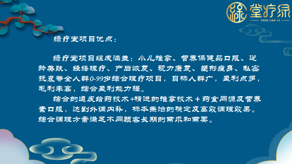 綠療堂項目組成涵蓋:小兒推拿、營養(yǎng)保健品口服、運齡美膚、經(jīng)絡(luò)理療、產(chǎn)后恢復、視力康復、塑形瘦身、私密抗衰等全人群0-99歲綜合理療項目,自標人群廣,盈利點多,毛利率高,綜合盈利能力強。綜合的透皮給藥技術(shù)+精進的推拿技術(shù)+藥食同源及營養(yǎng)素口服,達到外調(diào)內(nèi)補,標本兼洽的穩(wěn)定及高效調(diào)理效果。綜合調(diào)理方案滿足不同顧客長期的需求和需要。
