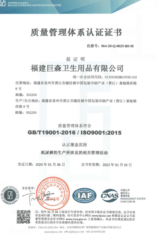 福建巨森衛(wèi)生用品有限公司于2017年初成立(原廠南昌巨森實(shí)業(yè)發(fā)展有限公司創(chuàng)立于2012年)。公司擁有一批高學(xué)歷、高素質(zhì)的管理骨干和敬業(yè)的生產(chǎn)團(tuán)隊(duì),以專業(yè)的技術(shù)、嚴(yán)謹(jǐn)?shù)墓芾、?yōu)良的設(shè)備、穩(wěn)定的貨源與強(qiáng)大的生產(chǎn)實(shí)力,為許多的客戶和代理商提供了優(yōu)質(zhì)的產(chǎn)品與服務(wù),得到了廣大客戶的信任與肯定。如今產(chǎn)品已經(jīng)覆蓋全國(guó)各地多個(gè)省、自治區(qū)、直轄市。在不斷擴(kuò)展業(yè)務(wù)的同時(shí),我們也致力于供應(yīng)鏈從源頭管控,有效地保證整個(gè)生產(chǎn)環(huán)節(jié)的安全與衛(wèi)生。2020年公司通過了ISO9001質(zhì)量體系認(rèn)證等在內(nèi)的8大國(guó)家及世界級(jí)權(quán)威機(jī)構(gòu)認(rèn)證,部分品牌還通過了醫(yī)護(hù)級(jí)產(chǎn)品認(rèn)證,產(chǎn)品質(zhì)量邁向了新的高度。品質(zhì)鑄就企業(yè),誠(chéng)信鑄就實(shí)力。