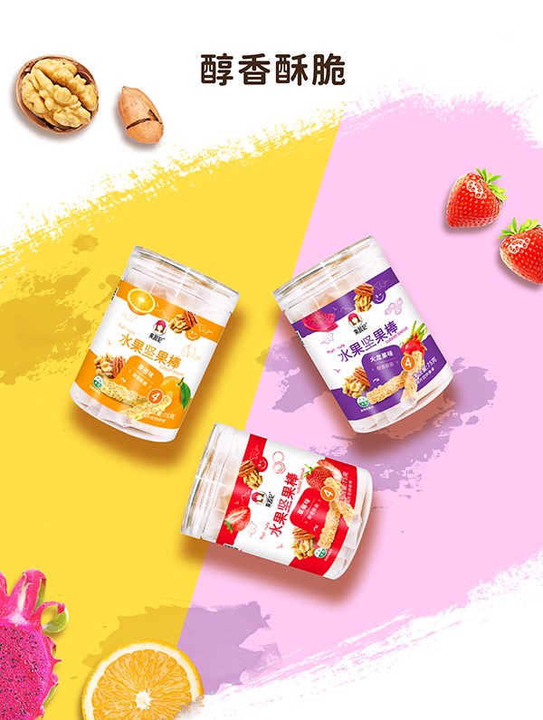 果蔬妃【水果堅果棒】充分結(jié)合水果與堅果的營養(yǎng)成分,融入花生、碧根果、芝麻、核桃的豐富口味,醇香酥脆,適合孕媽寶媽和3歲以上寶寶食用,有火龍果、草莓和香橙3種口味。