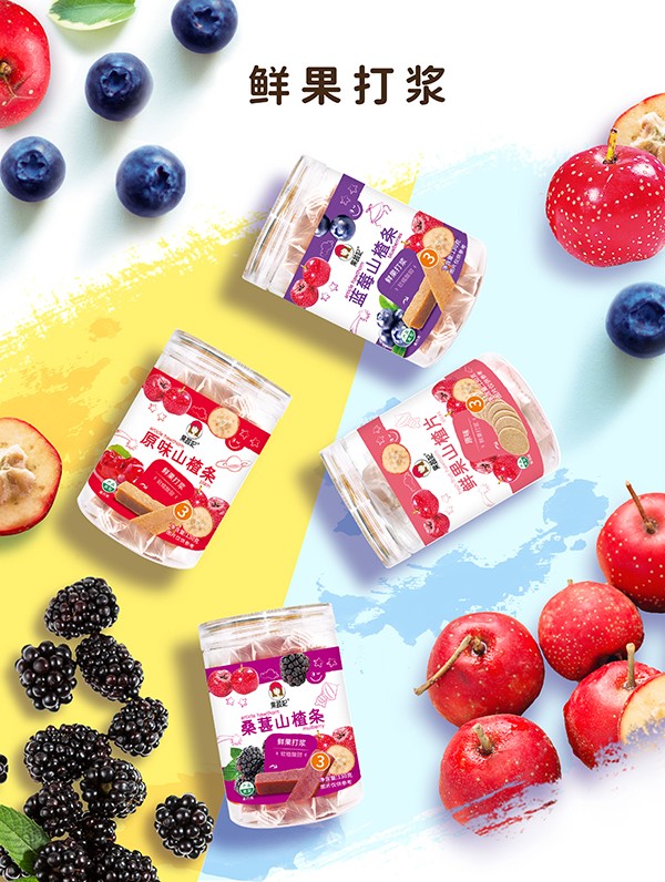 果蔬妃原汁山楂,原料十分簡單,將新鮮山楂蒸熟后去籽,然后添加鮮果打漿的蘋果、藍莓和桑葚等,烘烤成型后切塊,獨立包裝保持水分,最終得到幫助寶寶開胃消食、軟糯可口的果蔬山楂!
