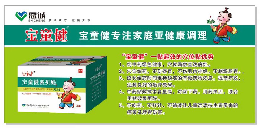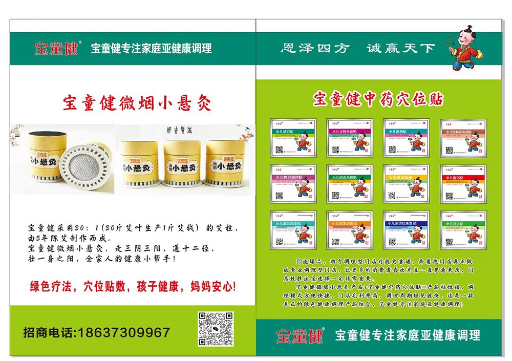 品牌名稱:寶童健 主營產(chǎn)品:寶童健小懸灸,寶童健中藥穴位貼,寶童健抑菌凝膠 品牌特色:傳承延續(xù)+綠色健康