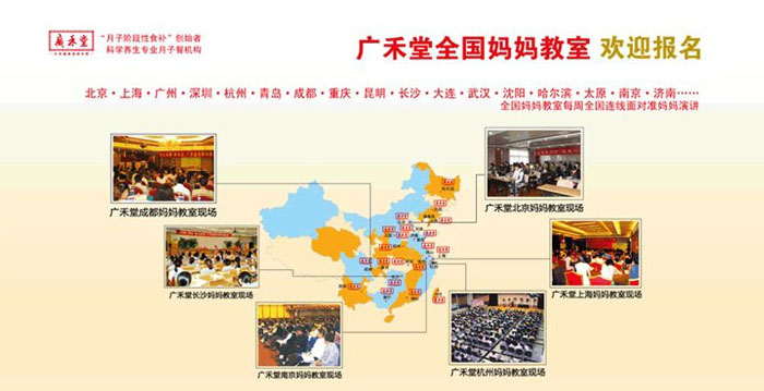 自成立以來,廣禾堂分別與上!皣H和平婦嬰保健院”、“第一婦嬰浦東分院”、“長寧婦幼保健院”、“上海美華醫(yī)院”、“計(jì)生委宣教中心”、“龍鳳食品”等單位密切合作,共同致力于“正確的養(yǎng)胎及坐月子方法”科學(xué)理念的推廣。