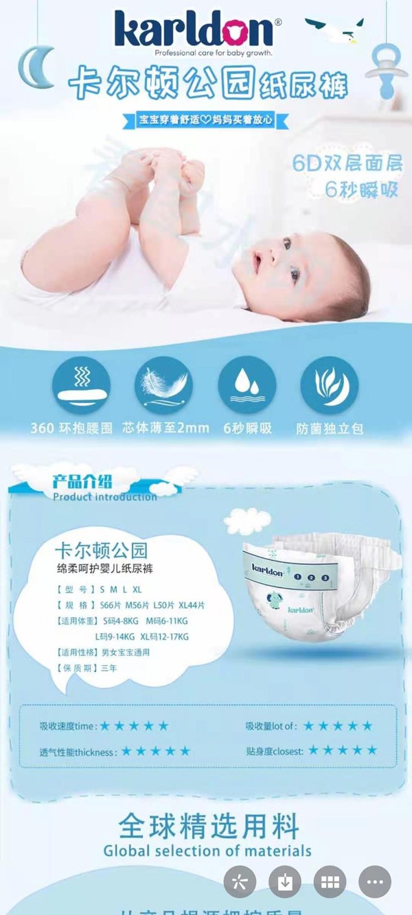 卡爾頓公園紙尿褲,專為長時間使用而設(shè)計(jì),能持久保持寶寶小屁屁干爽,透氣加倍,遠(yuǎn)離紅屁屁!快速6秒瞬吸鎖水,超薄柔軟,百分百全住友吸水因子,當(dāng)然更“靠譜”!6D復(fù)合技術(shù),隱藏式導(dǎo)流凹槽工藝,上億個微孔透氣,干爽加倍,舒適加倍!同時更采用人體工程學(xué)設(shè)計(jì),貼合小屁屁,減少腿部摩擦,穿脫建議,寶寶喜歡,媽媽省心!