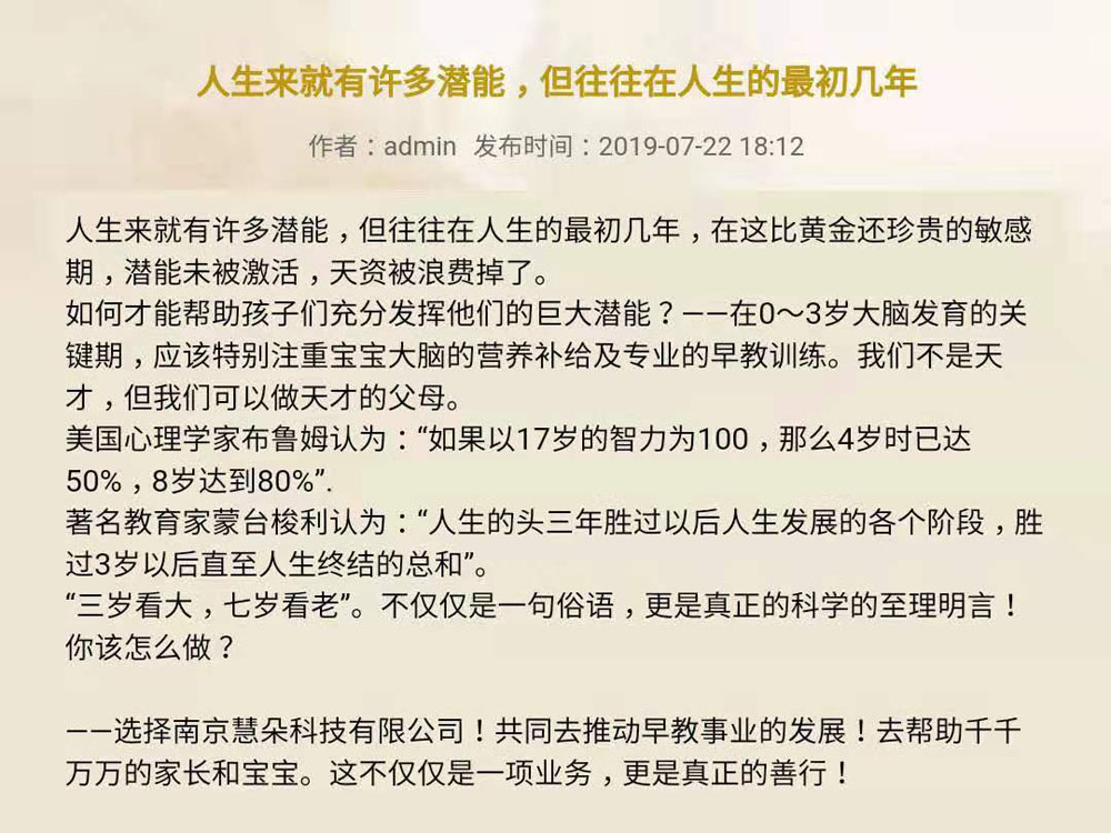 南京慧朵科技有限公司專注于母嬰事業(yè),致力于0~3歲寶寶的早教服務(wù)及相關(guān)產(chǎn)品的研發(fā)與推廣。