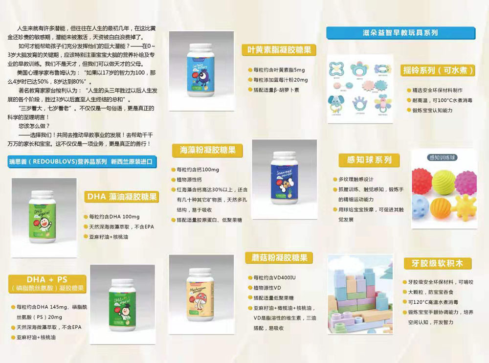 瑞思善(REDOUBLOVS)早教營養(yǎng)品系列,從綠色、無污染的新西蘭原裝進(jìn)口。瑞思善DHA藻油、DHA+磷脂酰絲氨酸(PS)、葉黃素酯、海藻粉(鈣)、蘑菇粉(VD),為成長健康提供全方面的呵護。