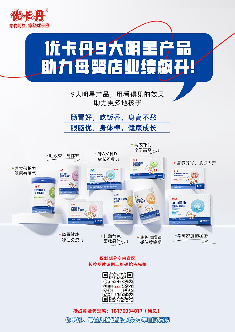 2022年,優(yōu)卡丹布局大健康行業(yè),開啟“制藥+功能性母嬰”雙航母格局。優(yōu)卡丹大健康誕生至今,始終秉承嚴(yán)苛制藥標(biāo)準(zhǔn),嚴(yán)謹(jǐn)定義功能性健康產(chǎn)品,從科技研發(fā)、原料探尋、科學(xué)生產(chǎn)出發(fā),專研更適合中國(guó)嬰幼兒和兒童青少年成長(zhǎng)的零輔食、保健膳食、洗護(hù)日化、日常用品等家中常備的功效調(diào)理型安心產(chǎn)品,用“醫(yī)研育養(yǎng),呵護(hù)成長(zhǎng)”的品牌理念,“以更好為更優(yōu)”的品牌精神,為中國(guó)家庭帶來更可靠、更值得信賴的健康選擇,全方位守護(hù)中國(guó)家庭兒女健康成長(zhǎng)。醫(yī)研育養(yǎng),呵護(hù)成長(zhǎng)!家有兒女,常備優(yōu)卡丹!