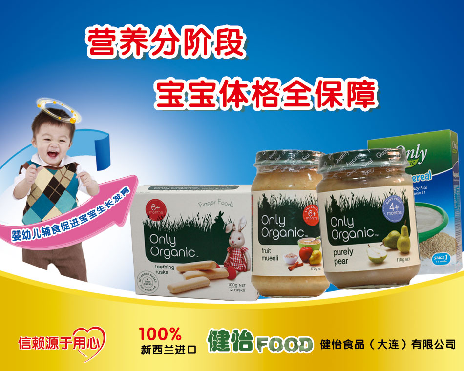 Onlyorganic(奧力)嬰幼兒有機食品,全部采用新西蘭本土新鮮的有機水果、蔬菜,經新西蘭------有機食品體系現(xiàn)場監(jiān)督加工而成,非規(guī);a,確保各批次產品質地純正、有據(jù)可查。再由先進的工業(yè)技術封閉罐裝,暢銷于南半球各大商超,成為新西蘭、澳大利亞等地區(qū)千萬媽媽喂養(yǎng)嬰幼兒的必須產品。近年來Onlyorgani(奧力)產品已經聲名遠播,在新加坡、日本、韓國等亞太地區(qū)的發(fā)達國家已經取得較好的銷量和口碑。
