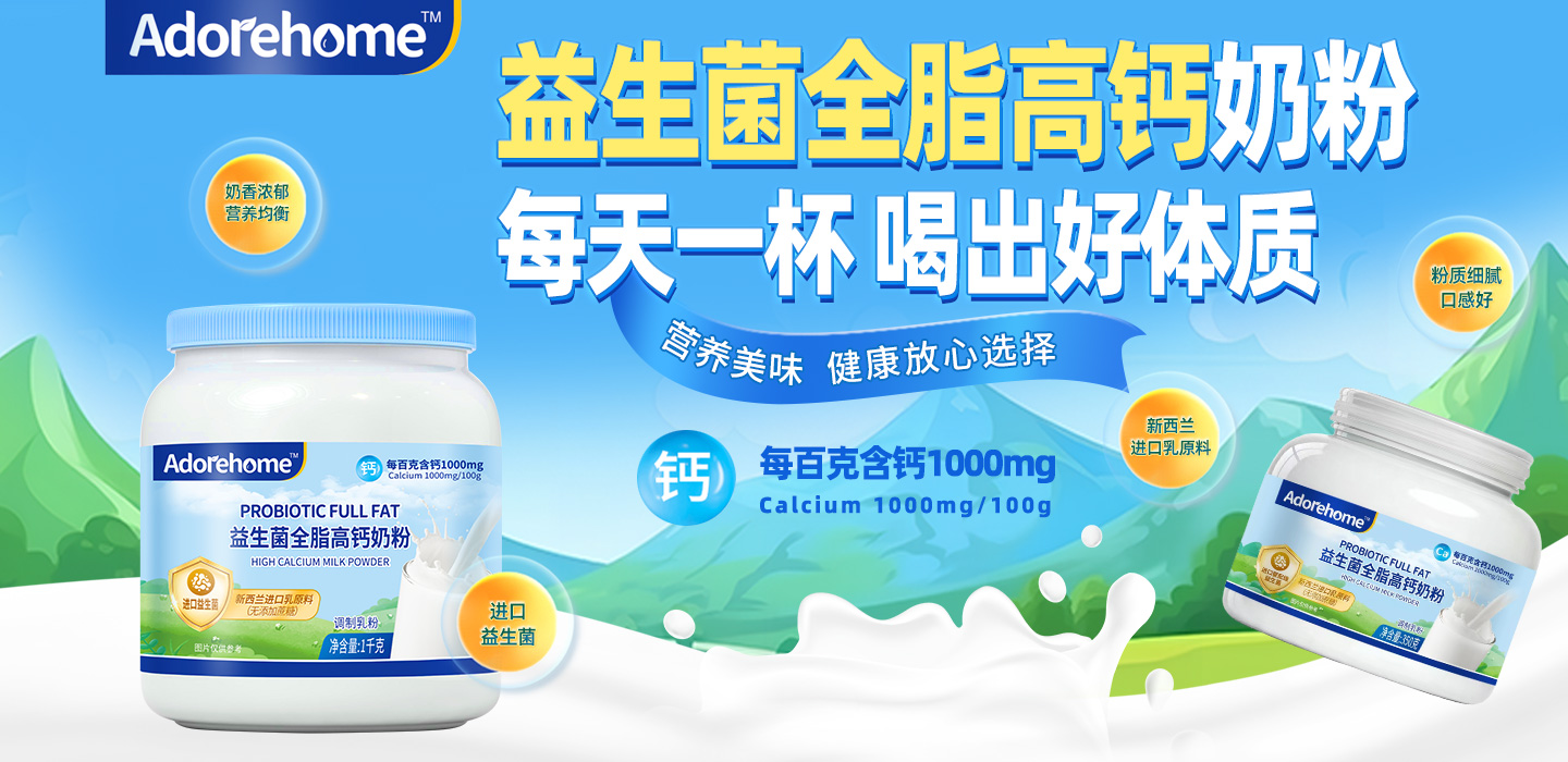 Adorehome益生菌全脂高鈣奶粉,新西蘭進(jìn)口乳原料,每100g含鈣1000mg,添加進(jìn)口益生菌,營養(yǎng)美味,粉質(zhì)細(xì)膩口感好,每天一杯,喝出好體質(zhì)。