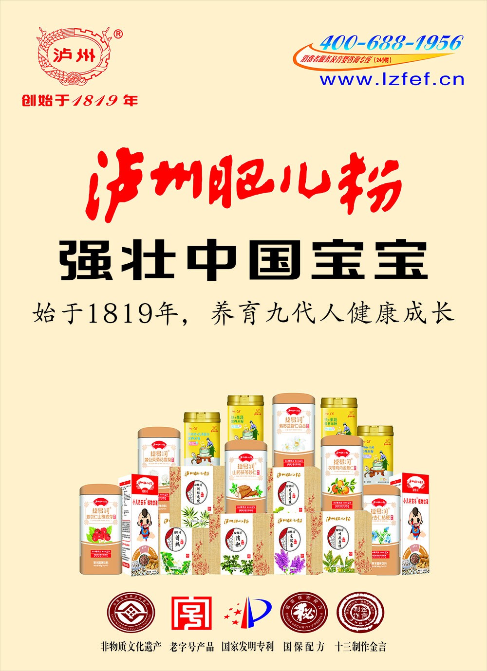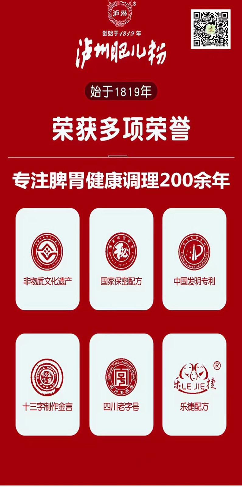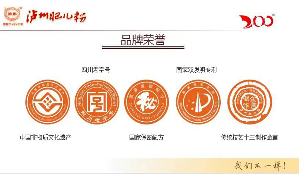 “瀘州肥兒粉”系有兩百年歷史傳承和六十年創(chuàng)牌與建廠史的嬰幼兒輔食及適合大眾養(yǎng)生和體弱多病中老年人食用的產(chǎn)品,我們獨特的“藥食同源配方”一度成為國家保密配方。“瀘州肥兒粉”的前生誕生于1819年瀘州人蔣宗明在小市開辦的“瀘州米羹羹”作坊。直到新中國成立后,“瀘州米羹羹”作坊的傳承人何汝彬于1956年6月將“瀘州米羹羹”作坊與當(dāng)時的瀘州市副食品加工廠合并成立了 “瀘州市地方國營北城肥兒粉廠”,陳雅南任廠長至退休!盀o州肥兒粉”是以“肥兒丸”古方為基礎(chǔ),主料為糙米,配料選用能健脾益胃、消食助運的大豆、綠豆、苡仁、芡實、建神曲等7-21種藥食同源級食材經(jīng)過“炒、燒、烤、燜、烘、焙,磨、蒸、煮、炙、碾、沙、土”等十三道手工工藝制作,發(fā)明創(chuàng)造的我國首例嬰幼兒藥理配方米粉。1956年夏,產(chǎn)品基本定型,并以“瀘州”二字設(shè)計制作了品牌標(biāo)記,第一代“瀘州肥兒粉”正式誕生。1960年4月3日成功注冊“肥兒粉”商標(biāo);又于1979年10月31日獲準(zhǔn)以“瀘州”為商標(biāo)使用,從此“瀘州肥兒粉”擁有了雙商標(biāo)。1988年,“瀘州肥  兒粉”被瀘州市醫(yī)藥管理局正式確定為保健食品;1993年“瀘州肥兒粉”獲得蒙古國烏蘭巴托國際食品博覽會金獎。