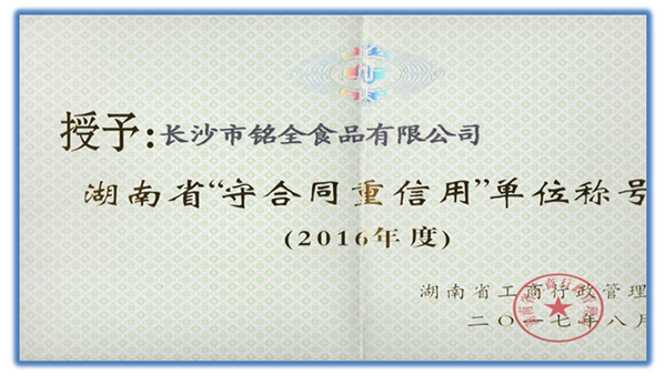 長(zhǎng)沙市銘全食品有限公司,連續(xù)5年銷(xiāo)量居全省前列,2017、2018年連續(xù)被授予湖南省“ 守合同重信用單位”稱(chēng)號(hào)。嚴(yán)控品質(zhì)同時(shí),精心研發(fā),不斷創(chuàng)新,兩年來(lái)申請(qǐng)外觀專(zhuān)利和實(shí)用型專(zhuān)利5項(xiàng)。