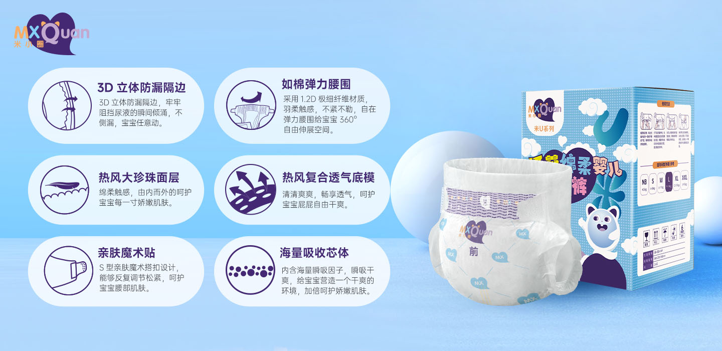 品牌名稱(chēng):米小圈 主營(yíng)產(chǎn)品:米小圈嬰兒紙尿褲 品牌特色:柔軟 大吸量 零刺激