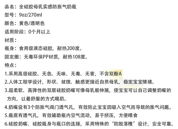 硅膠很柔軟,不用奶瓶刷用手也可以刷到奶瓶的各個(gè)角落,容易清洗。寶寶吸奶時(shí),奶瓶會(huì)隨著奶水的減少而自動(dòng)收縮,始終保持著瓶身內(nèi)外氣壓一致,避免寶寶吸入過(guò)多的空氣而導(dǎo)致嗆奶、腹脹等不適,有效解決喂奶時(shí)脹氣的煩惱,從而達(dá)到自動(dòng)呼吸的功能。