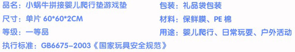 小蝸牛爬行墊無毒無味,防潮隔濕,超大無縫,表面附帶精美的童話圖案,從寶寶學(xué)爬到練習(xí)走路,再到大點(diǎn)在地上玩耍蹦跳,都是不錯(cuò)的選擇,是寶寶健康快樂成長的好伴侶。