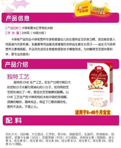 卡咪呢有機(jī)米粉系列是專為中國(guó)寶寶設(shè)計(jì)的營(yíng)養(yǎng)輔食,選用有機(jī)大米,科學(xué)搭配維生素AD等維生素,還特別添加;撬、DHA、AA等有助智力發(fā)育的營(yíng)養(yǎng)成分,富含15種營(yíng)養(yǎng)素,F(xiàn)上?ㄟ淠啬笅胗闷酚邢薰久嫦蛉珖(guó)空白市場(chǎng)區(qū)域誠(chéng)招卡咪呢有機(jī)米粉代理商。