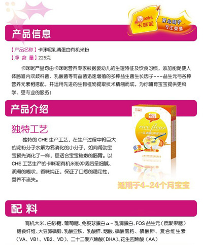 卡咪呢乳清蛋白嬰幼兒營養(yǎng)米粉是上海卡咪呢母嬰用品有限公司旗下產(chǎn)品,精選優(yōu)質(zhì)大米制作,特別添加乳清蛋白和益生元,提高寶寶抵抗力,促進(jìn)寶寶changdao的消化吸收,上市以來廣受父母消費(fèi)者的青睞。