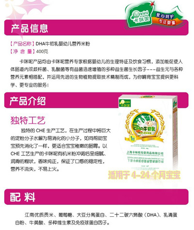 卡咪呢有機(jī)米粉系列是專為中國寶寶設(shè)計(jì)的營養(yǎng)輔食,選用有機(jī)大米,科學(xué)搭配維生素AD等維生素,還特別添加牛磺酸、DHA、AA等有助智力發(fā)育的營養(yǎng)成分,富含15種營養(yǎng)素。現(xiàn)上?ㄟ淠啬笅胗闷酚邢薰久嫦蛉珖瞻资袌鰠^(qū)域誠招卡咪呢有機(jī)米粉代理商。