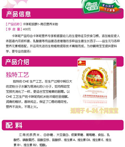 卡咪呢乳清蛋白嬰幼兒營養(yǎng)米粉是上?ㄟ淠啬笅胗闷酚邢薰酒煜庐a(chǎn)品,精選優(yōu)質(zhì)大米制作,特別添加乳清蛋白和益生元,提高寶寶抵抗力,促進寶寶changdao的消化吸收,上市以來廣受父母消費者的青睞。