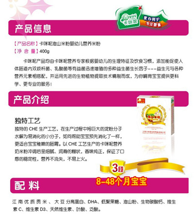 卡咪呢有機(jī)米粉系列是專為中國(guó)寶寶設(shè)計(jì)的營(yíng)養(yǎng)輔食,選用有機(jī)大米,科學(xué)搭配維生素AD等維生素,還特別添加;撬、DHA、AA等有助智力發(fā)育的營(yíng)養(yǎng)成分,富含15種營(yíng)養(yǎng)素,F(xiàn)上?ㄟ淠啬笅胗闷酚邢薰久嫦蛉珖(guó)空白市場(chǎng)區(qū)域誠(chéng)招卡咪呢有機(jī)米粉代理商。