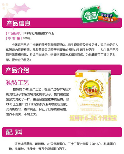 卡咪呢乳清蛋白嬰幼兒營養(yǎng)米粉是上?ㄟ淠啬笅胗闷酚邢薰酒煜庐a(chǎn)品,精選優(yōu)質(zhì)大米制作,特別添加乳清蛋白和益生元,提高寶寶抵抗力,促進寶寶changdao的消化吸收,上市以來廣受父母消費者的青睞。