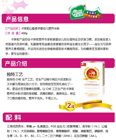 卡咪呢有機(jī)米粉系列是專為中國寶寶設(shè)計(jì)的營養(yǎng)輔食,選用有機(jī)大米,科學(xué)搭配維生素AD等維生素,還特別添加牛磺酸、DHA、AA等有助智力發(fā)育的營養(yǎng)成分,富含15種營養(yǎng)素。現(xiàn)上?ㄟ淠啬笅胗闷酚邢薰久嫦蛉珖瞻资袌鰠^(qū)域誠招卡咪呢有機(jī)米粉代理商。