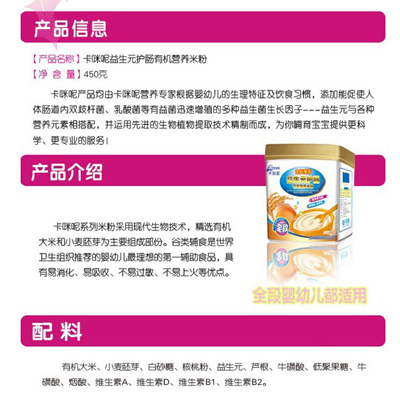卡咪呢有機(jī)米粉系列是專為中國寶寶設(shè)計(jì)的營養(yǎng)輔食,選用有機(jī)大米,科學(xué)搭配維生素AD等維生素,還特別添加牛磺酸、DHA、AA等有助智力發(fā)育的營養(yǎng)成分,富含15種營養(yǎng)素,F(xiàn)上?ㄟ淠啬笅胗闷酚邢薰久嫦蛉珖瞻资袌鰠^(qū)域誠招卡咪呢有機(jī)米粉代理商。