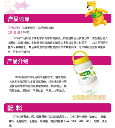 卡咪呢有機(jī)米粉系列是專為中國(guó)寶寶設(shè)計(jì)的營(yíng)養(yǎng)輔食,選用有機(jī)大米,科學(xué)搭配維生素AD等維生素,還特別添加;撬、DHA、AA等有助智力發(fā)育的營(yíng)養(yǎng)成分,富含15種營(yíng)養(yǎng)素,F(xiàn)上海卡咪呢母嬰用品有限公司面向全國(guó)空白市場(chǎng)區(qū)域誠(chéng)招卡咪呢有機(jī)米粉代理商。