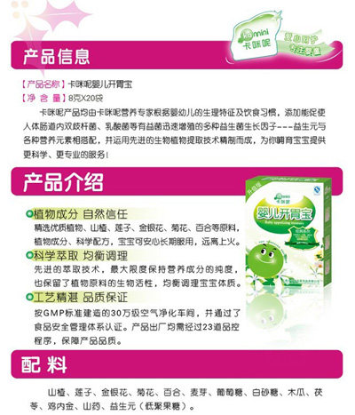 上海卡咪呢母嬰用品有限公司主營母嬰營養(yǎng)保健食品,產(chǎn)品原料來自有機農(nóng)業(yè)生產(chǎn)體系或野生天然產(chǎn)品,通過國家相關(guān)有機食品認證機構(gòu)的嚴格檢測認證,現(xiàn)面向全國空白市場區(qū)域誠招代理商加盟。