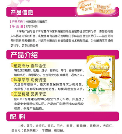 卡咪呢小兒板藍(lán)根顆粒是上?ㄟ淠啬笅胗闷酚邢薰酒煜庐a(chǎn)品,專為嬰幼兒設(shè)計,專業(yè)、安全,幫助寶寶可以預(yù)防感冒抵抗病毒,是廣大父母育兒的好幫手?ㄟ淠匦喊逅{(lán)根顆粒不含任何色素、防腐劑,安全放心。