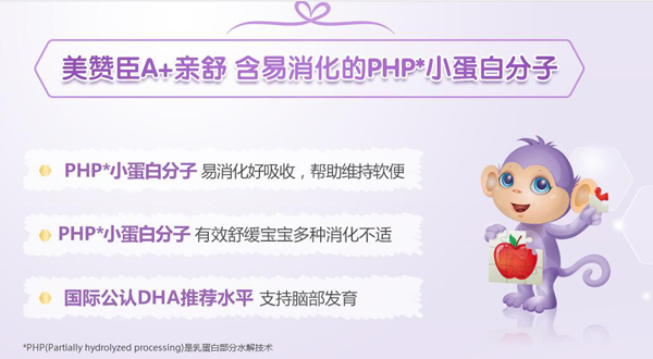 美贊臣親舒奶粉中的親舒配方主要指PHP小蛋白配方,而PHP小蛋白分子能夠使奶粉易消化好吸收,幫助維持軟便,可有效緩解寶寶多種消化不適。
