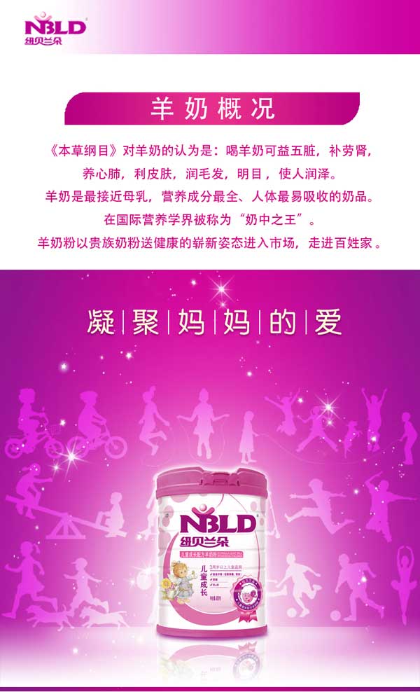紐貝蘭朵羊奶粉由資深營養(yǎng)專家,專門針對中國人群研制而成的,奶源純正,配方更科學,營養(yǎng)均衡,容易消化吸收,不易上火,有很強的市場競爭力。
