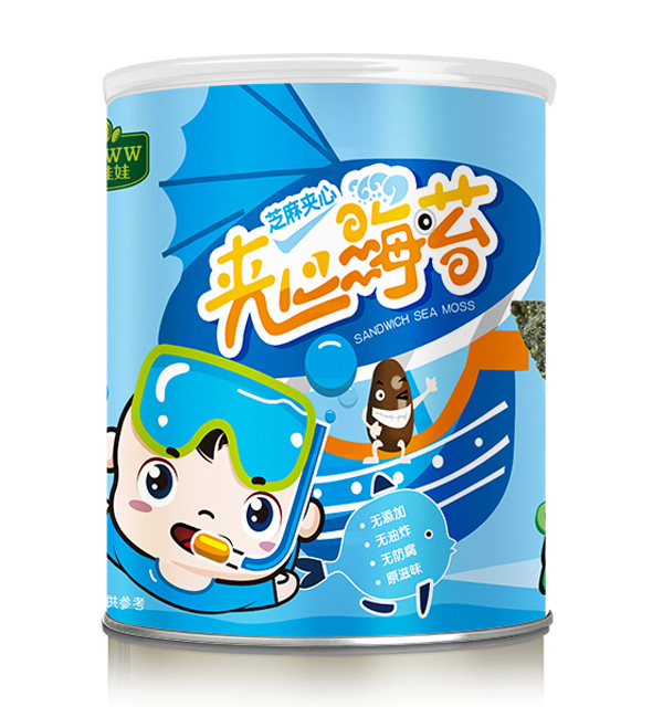 好娃娃夾心海苔系列有桶裝、袋裝兩個(gè)包裝,采用的是進(jìn)口無(wú)污染,自然生成且生長(zhǎng)周期合適的條斑紫菜