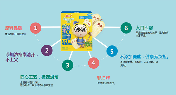 每款口味均首創(chuàng)特別添加了梨清汁,梨汁的清甜與米餅完美融合,保證了米餅口味的天然,不添加糖鹽,健康無負(fù)擔(dān)。