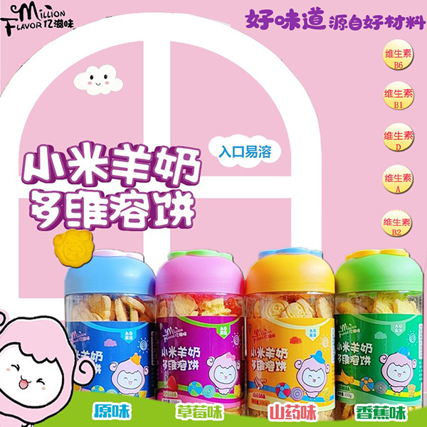 億滋味小米羊奶多維溶餅,特別精選日光小米制作,易吸收,好消化,獨(dú)有配方,入口易溶,只酥不硬哦!且富含多種維生素:維生素B1、維生素B2、維生素A、維生素D、維生素B6,健康營(yíng)養(yǎng)更有滋味。