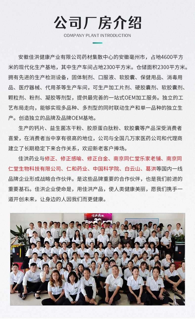 安徽佳洪健康產(chǎn)業(yè)有限公司位于全球最大的中藥材集散中心安徽亳州市,占地4600平方的現(xiàn)代化生產(chǎn)基地,其中生產(chǎn)車間占地2300平。倉儲(chǔ)面積2300平。國際先進(jìn)的生產(chǎn)檢測設(shè)備,固體制劑、口服液、軟膠囊、保健用品、消毒用品、醫(yī)療器械、代用茶等生產(chǎn)車間,可生產(chǎn)加工片劑、硬膠囊劑、軟膠囊劑、顆粒劑、粉劑、凝膠等劑型,提供最完善的一站式OEM加工服務(wù)。獨(dú)立的工藝布局走向,能夠?qū)崿F(xiàn)多品種、多劑型的同時(shí)聯(lián)動(dòng)生產(chǎn)和單一品種的獨(dú)立生產(chǎn)。創(chuàng)造獨(dú)立的品牌及品牌OEM基地。