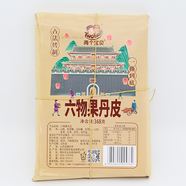兩個寶貝六物果丹皮,傳承經(jīng)典,選用藥食同源食材:山楂、山藥、麥芽、紅棗、茯苓、雞內(nèi)金,古法烤制,六物合一,酸酸甜甜,自然好味道!大分量,更滿足,一撕到底!不添加香精、色素、防腐劑,吃的美味,吃的放心,吃出健康好胃口!