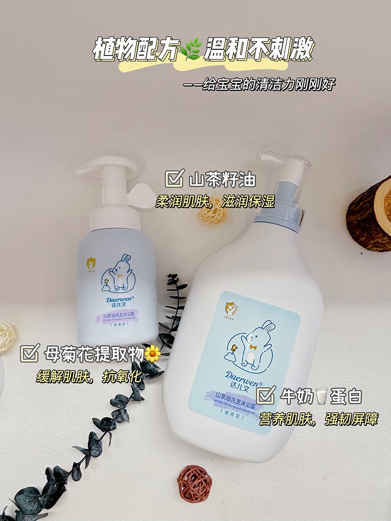 達(dá)兒文山茶油洗發(fā)沐浴露滋潤型,根據(jù)寶寶嬌嫩肌膚和發(fā)毛特點(diǎn)設(shè)計(jì),深層滋養(yǎng),溫和潔凈,植物萃取。
