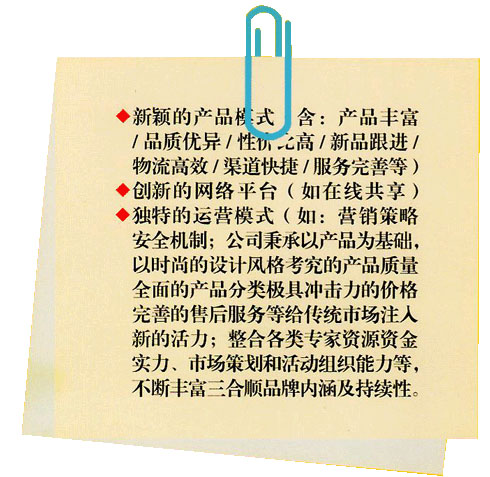 2007 年,三合順制定新時(shí)期發(fā)展戰(zhàn)略,以“童悅”作為公司自有主打品牌,秉承“一切為了孩子”這一核心理念,橫跨自行車和兒童用品兩大行業(yè),專業(yè)從事系列化兒童用品創(chuàng)新研發(fā)、組織生產(chǎn)、外貿(mào)內(nèi)銷和文化服務(wù),建立覆蓋“供—產(chǎn)—儲(chǔ)—運(yùn)—展—銷—交—服”供應(yīng)鏈系統(tǒng)解決方案的強(qiáng)勢(shì)品牌。同時(shí),三合順與北京中卡世紀(jì)動(dòng)漫文化傳媒有限公司達(dá)成戰(zhàn)略合作,制作品牌動(dòng)畫片,全程助力“童悅”品牌形象的創(chuàng)建和推廣。