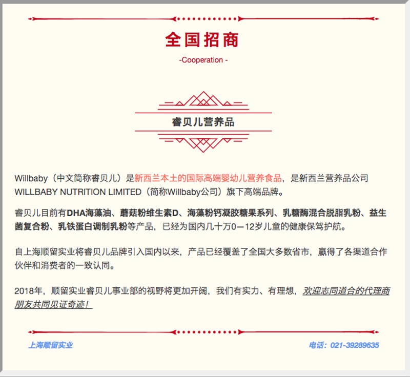做為Willbaby中國(guó)總代理,上海順留實(shí)業(yè)發(fā)展有限公司成立于2009年,專注致力于母嬰營(yíng)養(yǎng)品的研發(fā)、營(yíng)銷和品牌化運(yùn)作。2016年與澳大利亞GMP制藥集團(tuán)下屬子公司新西蘭GMP Dairy Limited 合作,引進(jìn)新西蘭原裝進(jìn)口睿貝兒營(yíng)養(yǎng)食品,以滿足廣大消費(fèi)者的需求。