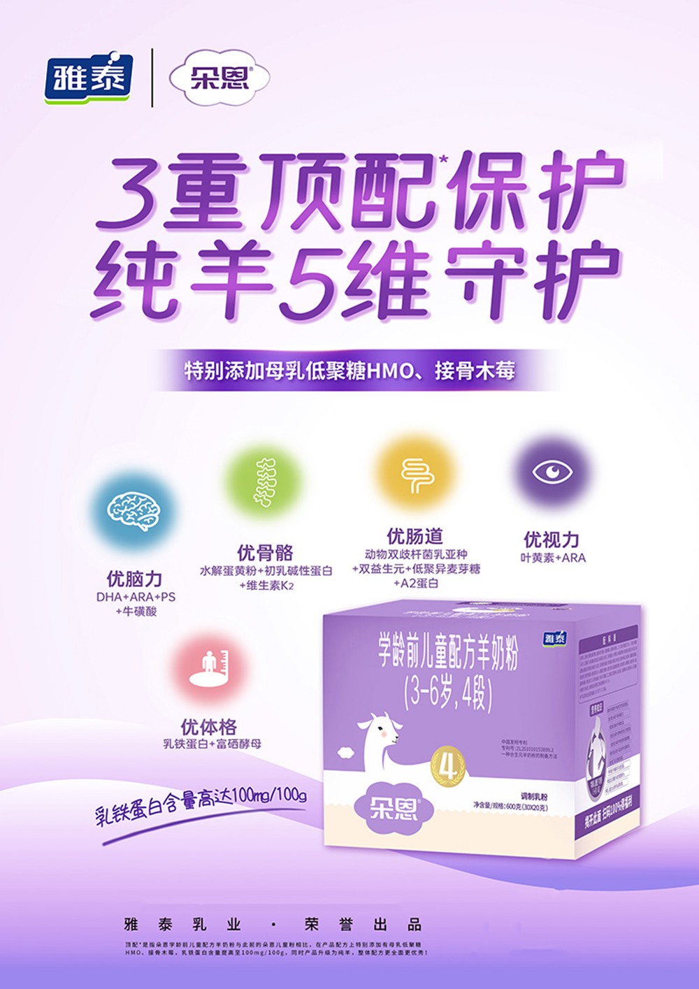 朵恩作為雅泰乳業(yè)旗下知名羊奶粉品牌,于2022年底順利通過新國標(biāo)和二次配方注冊,率先搶占了新國標(biāo)時代的先發(fā)優(yōu)勢!在產(chǎn)品配方上,以“高端+高配”定位,特別提出了“三代OPO更親和,12倍乳鐵蛋白強(qiáng)守護(hù)”的配方優(yōu)勢,引領(lǐng)新國標(biāo)時代!