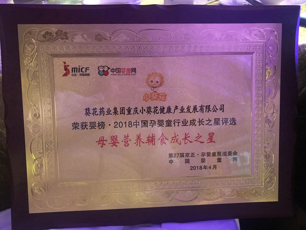 企業(yè)被世界衛(wèi)生組織兒童衛(wèi)生合作中心等四家單位聯(lián)合授予“兒童用藥安全突出貢獻(xiàn)單位”;“小葵花”品牌連續(xù)五屆榮登“健康中國(guó)-中國(guó)藥品品牌榜”,葵花牌小兒肺熱咳喘口服液/顆粒2017、2018、2019連續(xù)三年被中國(guó)非處方協(xié)會(huì)認(rèn)定為“中成藥兒科感冒咳嗽類(lèi)第一名”。