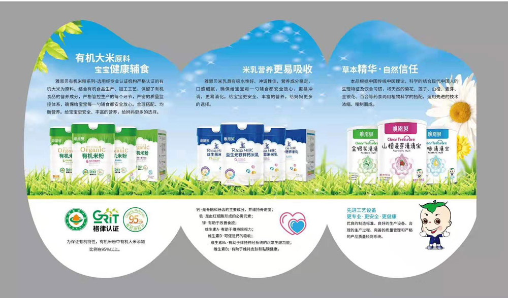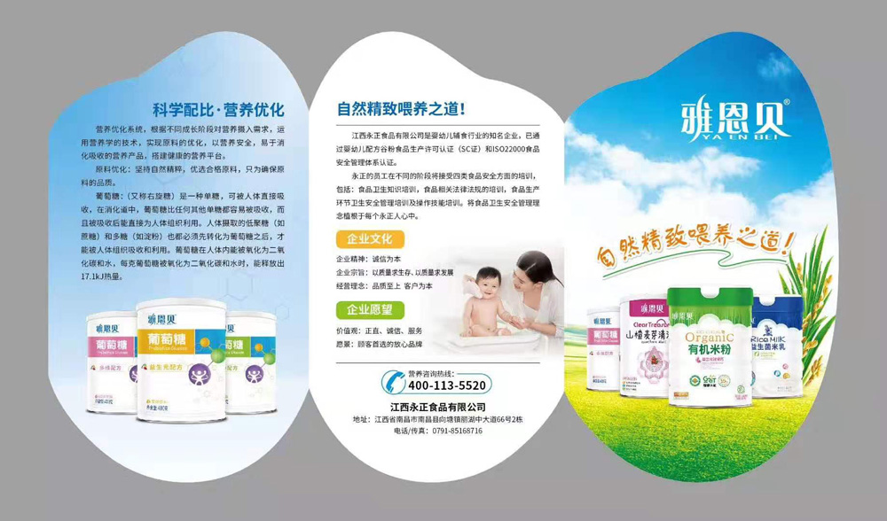 “雅恩貝”是江西永正食品有限公司旗下主打品牌,公司成立于2016年5月26日,是國(guó)家制定新政后的新型嬰幼兒輔食企業(yè)。企業(yè)已經(jīng)通過嬰幼兒配方谷粉食品生產(chǎn)許可證(證號(hào):SC10636012111666)和ISO22000食品安全體系認(rèn)證。本著“專業(yè)執(zhí)著,精益求精”的工作原則,秉承“品質(zhì)至上,客戶為本”經(jīng)營(yíng)理念,研制生產(chǎn)了適合嬰幼兒健康營(yíng)養(yǎng)需要的米粉類,清火寶類,葡萄糖類等系列產(chǎn)品。