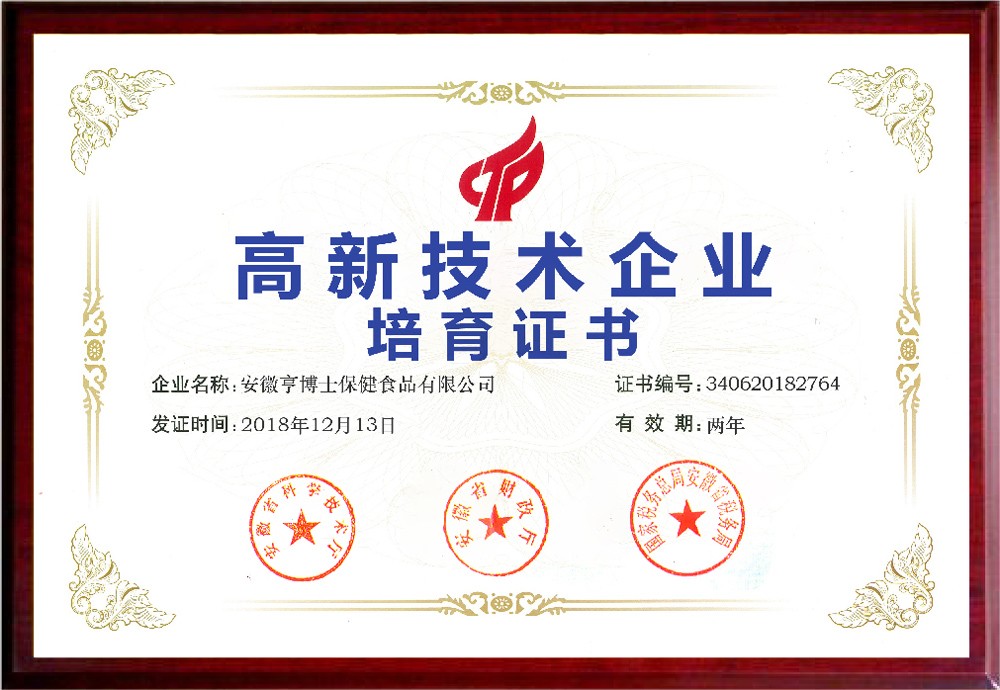 安徽亨博士保健食品有限公司是一家集研發(fā)、生產(chǎn)、銷售于一體的現(xiàn)代化健康食品生產(chǎn)企業(yè),公司于2013年成立,2017年初獲批食品生產(chǎn)許可證,2018年獲批“亨博士功能性食品研發(fā)中心”,“ISO9000認(rèn)證”,目前擁有1萬平米凈化車間,100多名員工,10多名研發(fā)人員,與阜陽(yáng)大學(xué),安徽農(nóng)業(yè)大學(xué)簽署產(chǎn)學(xué)研協(xié)議,公司先后獲得“省級(jí)專精特新中小企業(yè)”、“國(guó)家高新技術(shù)培育企業(yè)”、“市級(jí)十佳青年明星企業(yè)”、“市級(jí)農(nóng)業(yè)產(chǎn)業(yè)龍頭企業(yè)”等榮譽(yù)稱號(hào)。