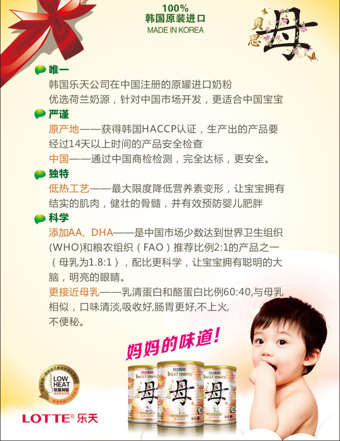 2、貝思母(韓國樂天旗下品牌)面向全國誠招代理商,歡迎加盟!如果您沒有雄厚的資金實(shí)力、沒有完善的分銷渠道、沒有優(yōu)化 的營銷渠道、沒有通達(dá)的人脈網(wǎng)絡(luò),只要您有共同努力的決心、創(chuàng)建事業(yè)的激情、永不言棄的堅(jiān)持、 具備服務(wù)于大眾健康事業(yè)的 意愿,您就是貝思母永遠(yuǎn)值得信賴的朋友!