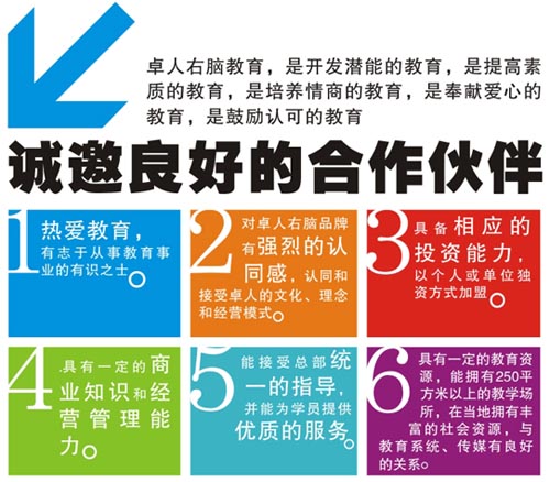 卓人創(chuàng)建于2004年,是一家專業(yè)從事早教及右腦潛能教育的教育機構(gòu),其右腦潛能的研究成果、右腦潛能課程、教具學(xué)具及所創(chuàng)辦的早教、潛能培訓(xùn)學(xué)校享譽國內(nèi)外。