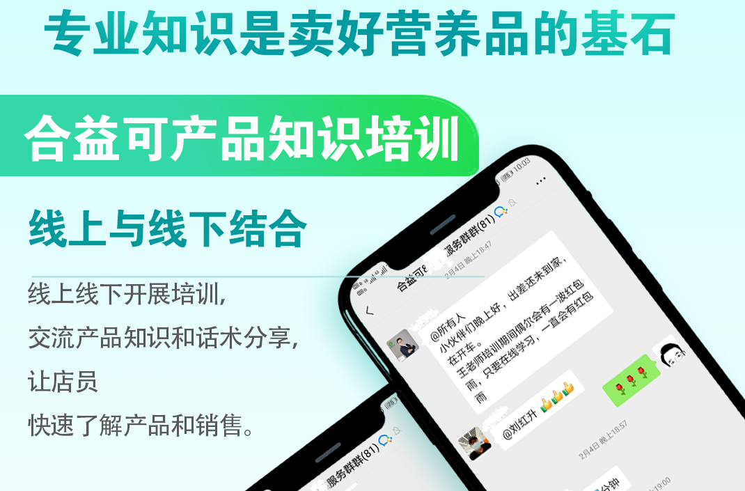 作為一個(gè)專業(yè)營(yíng)養(yǎng)品品牌,深知專業(yè)性對(duì)家庭健康的重要性,更是門店?duì)I養(yǎng)品銷售的核心,門店與客戶信任與忠誠的紐帶,再好的營(yíng)養(yǎng)品,離不開專業(yè)的服務(wù),合益可商學(xué)院應(yīng)運(yùn)而生——提升合作門店專業(yè)度。通過線上線下知識(shí)培訓(xùn)的開展,讓合作門店從最初的產(chǎn)品認(rèn)知到相關(guān)營(yíng)養(yǎng)品知識(shí)學(xué)習(xí),從單一產(chǎn)品的專業(yè)知識(shí)到母嬰護(hù)理全面營(yíng)養(yǎng)知識(shí)學(xué)習(xí)。