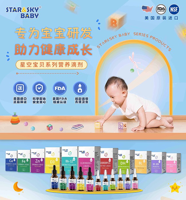 星空寶貝兒童營(yíng)養(yǎng)滴劑,有益生菌、鈣鐵鋅、接骨木莓、消化酶、乳糖酶等多款單品,美國(guó)原裝進(jìn)口,精研品質(zhì),高含量,易吸收,無(wú)負(fù)擔(dān)。液態(tài)滴劑形式,食用方便,口感適宜,隨時(shí)補(bǔ)充。