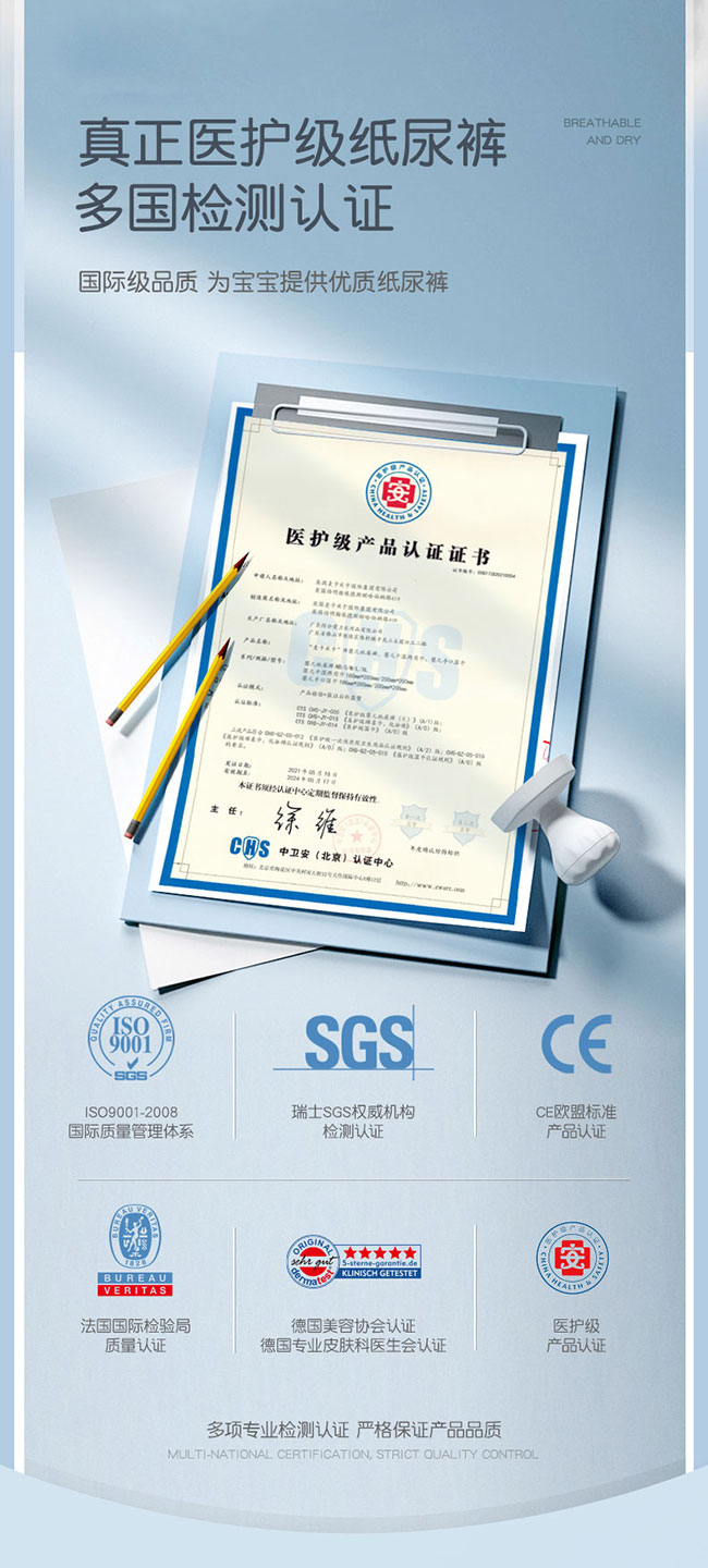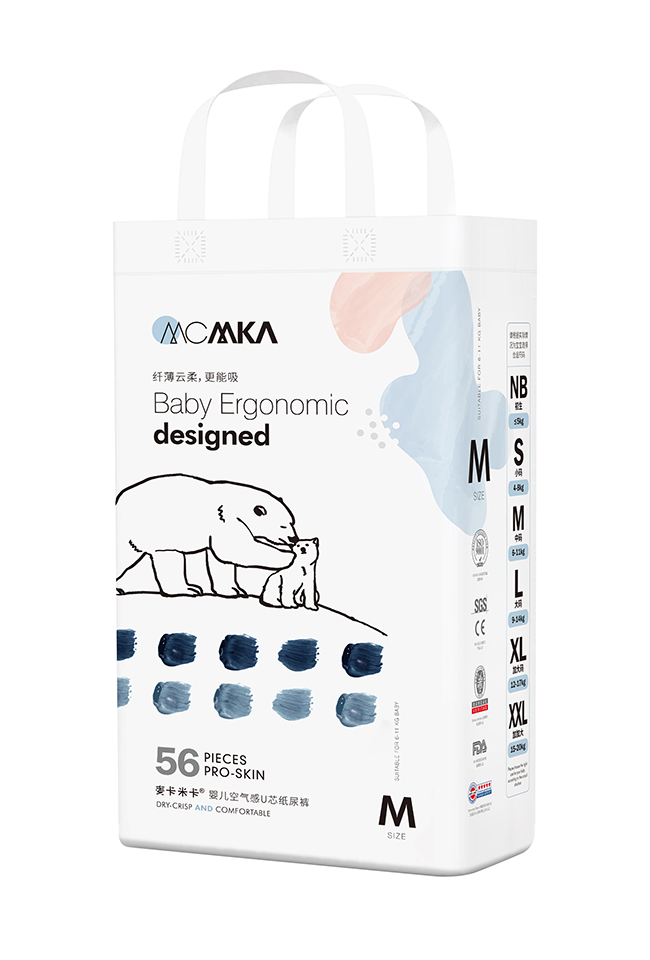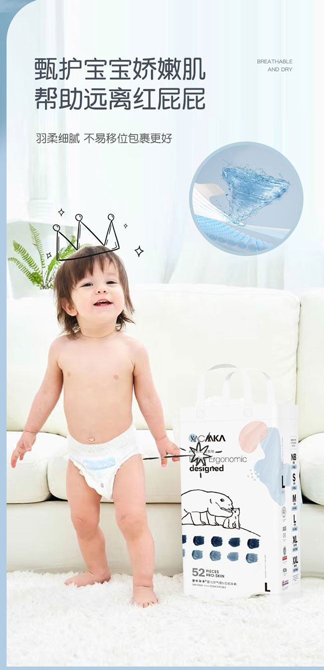 麥卡米卡嬰兒空氣感U芯紙尿褲,醫(yī)護(hù)級紙尿褲,多國檢測認(rèn)證。羽毛般輕薄,薄至0.1cm,無感般穿著,透氣舒適,自有呼吸不悶熱;臺灣進(jìn)口面層,梅花打孔設(shè)計(jì),先進(jìn)單層水刺布技術(shù),更輕薄,更柔軟親膚,讓寶寶的小屁屁更干爽,更舒服。日本進(jìn)口芯體,不易起坨斷層,自主獨(dú)特吸水系統(tǒng),海量瞬吸;全方位立體打孔,底膜25000個(gè)透氣孔,迅速散熱排濕,甄護(hù)寶寶嬌嫩肌膚,遠(yuǎn)離紅屁屁;羽柔細(xì)膩,不易移位,包裹更好;雙層防側(cè)漏,安睡一整晚。