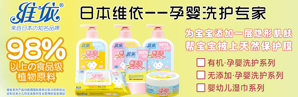 16年來,維依孕嬰系列產(chǎn)品一直在國際高端市場中的日本、歐洲、美國和香港等國家和地區(qū)的大流通渠道和專業(yè)渠道中熱銷。今天,綠色、天然、溫和、安全、優(yōu)質(zhì)的維依產(chǎn)品已經(jīng)進入了中國,讓中國寶寶萃享天然有機精華。