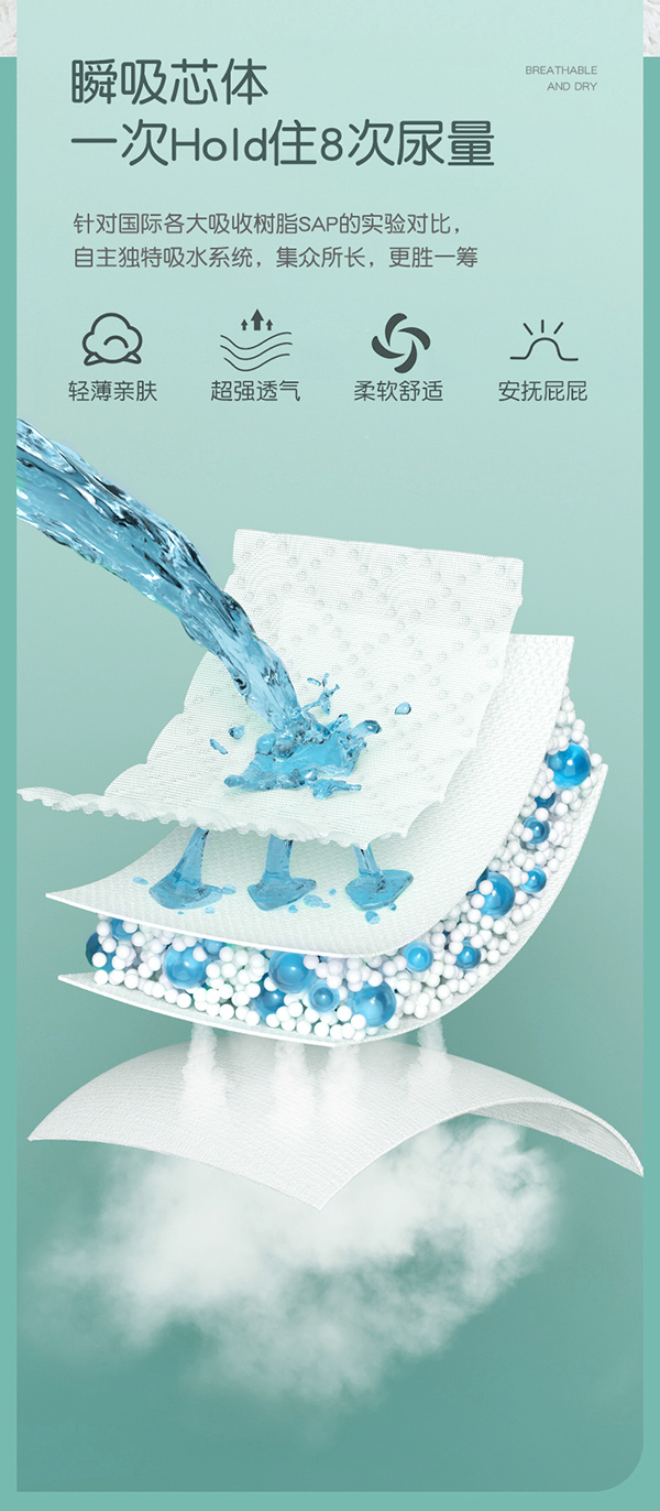 麥卡米卡暢氧超芯體學(xué)步褲,第4代“超芯”,更薄、更快、更干爽、更安全!獨(dú)創(chuàng)芯體U型槽,吸收更快,更大容量;超聲波壓合云朵凸點(diǎn)面層,減少皮膚接觸面,遠(yuǎn)離紅屁股;大環(huán)腰體貼腰圍,防漏不勒紅;立體雙層防漏,護(hù)圍拉伸自動外翻設(shè)計(jì),有效防止側(cè)漏;0.1cm超薄芯,一片尿褲反鎖整夜尿量;臺灣進(jìn)口面層,立體打孔,輕松吸收,迅速把干;醫(yī)護(hù)級紙尿褲,多國檢測認(rèn)證,安全放心。